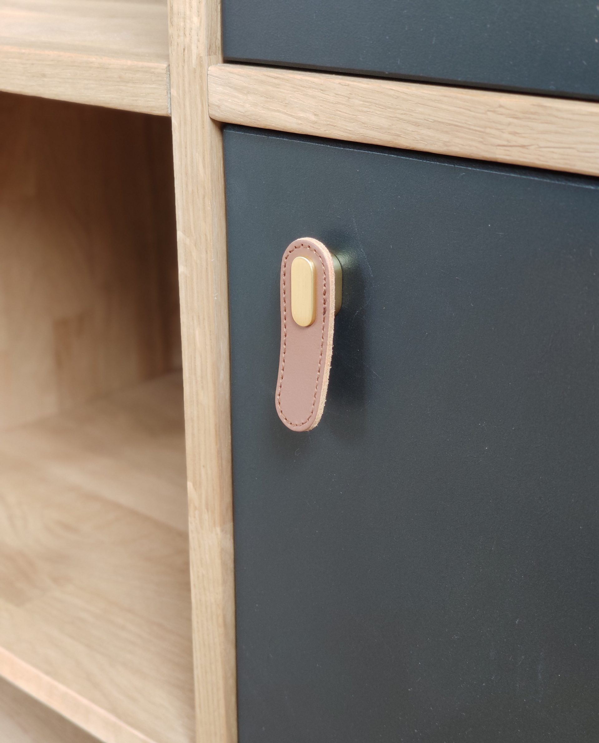 plateau et structure chêne massif lamellé collé, façades en médium peint noir mat, hairpings legs en acier patiné noir, boutons cuir et métal doré