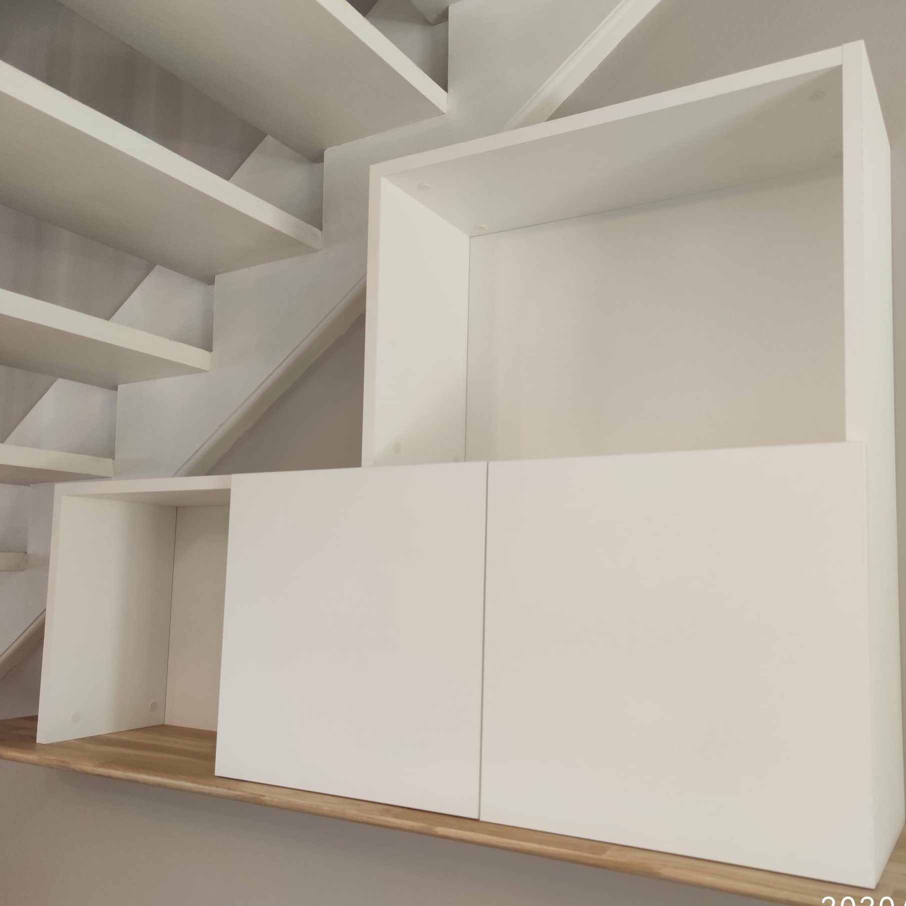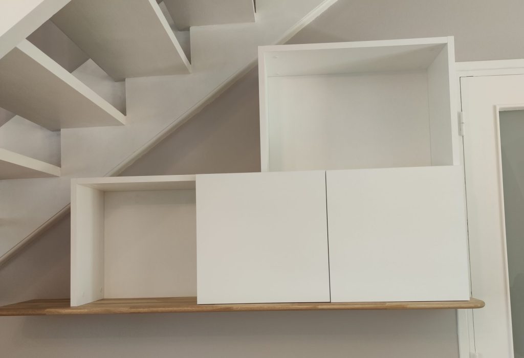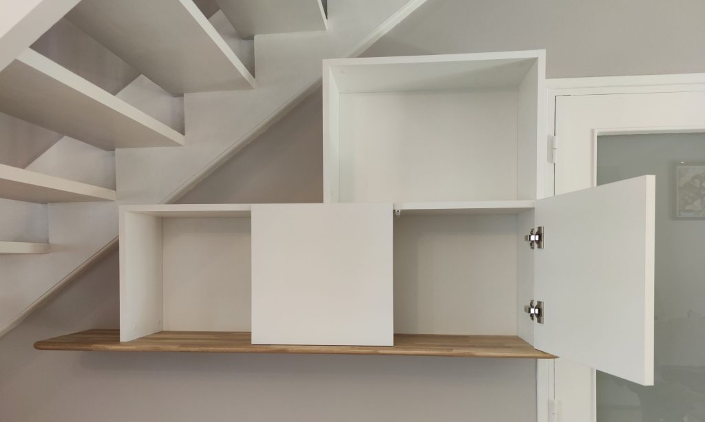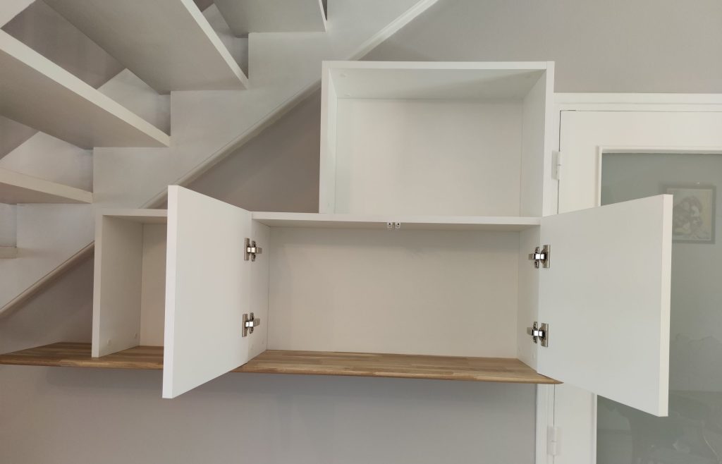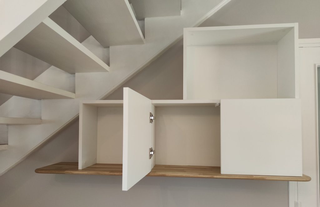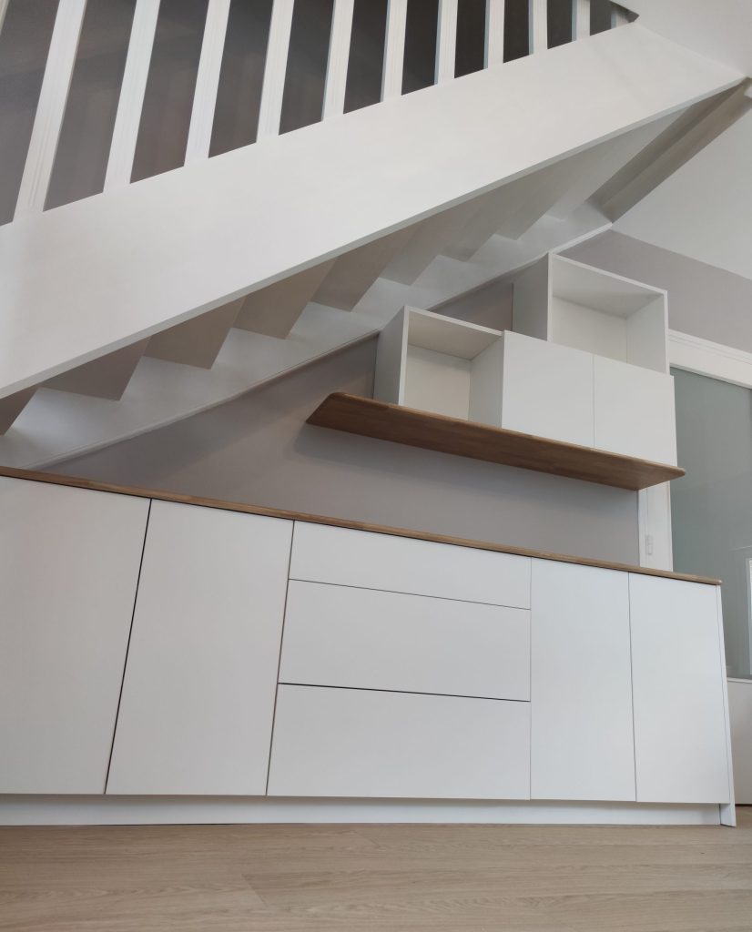 structure et façades en médium laqué blanc mat « Egger perfect sense », tablette en chêne massif lamellé collé finition huilée